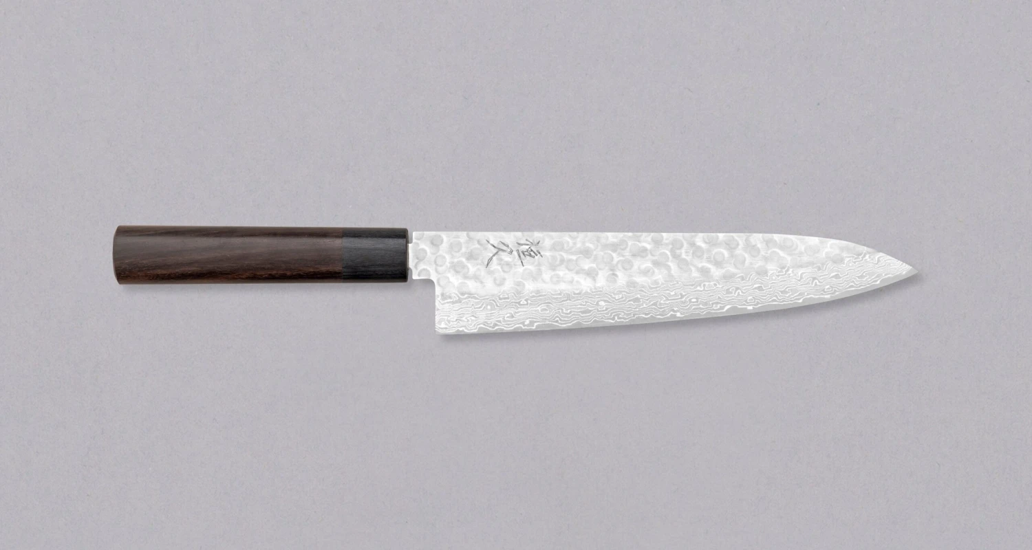 Gyuto is the most versatile and useful blade shape in the modern kitchen. It has a wide profile with an extra height clearance for easy food transfer and tends to be fairly flat towards the heel, enabling easy and fast chopping on the cutting board. A pointed tip allows piercing and precise, delicate work. A slight curve between the tip and the midsection makes the belly great for rocking the blade back and forth when cutting. It can be used for cutting meat, fish and vegetables. The knife is simple to maintain, retains its edge for a very long time and is perfect for sharpening on water stones.