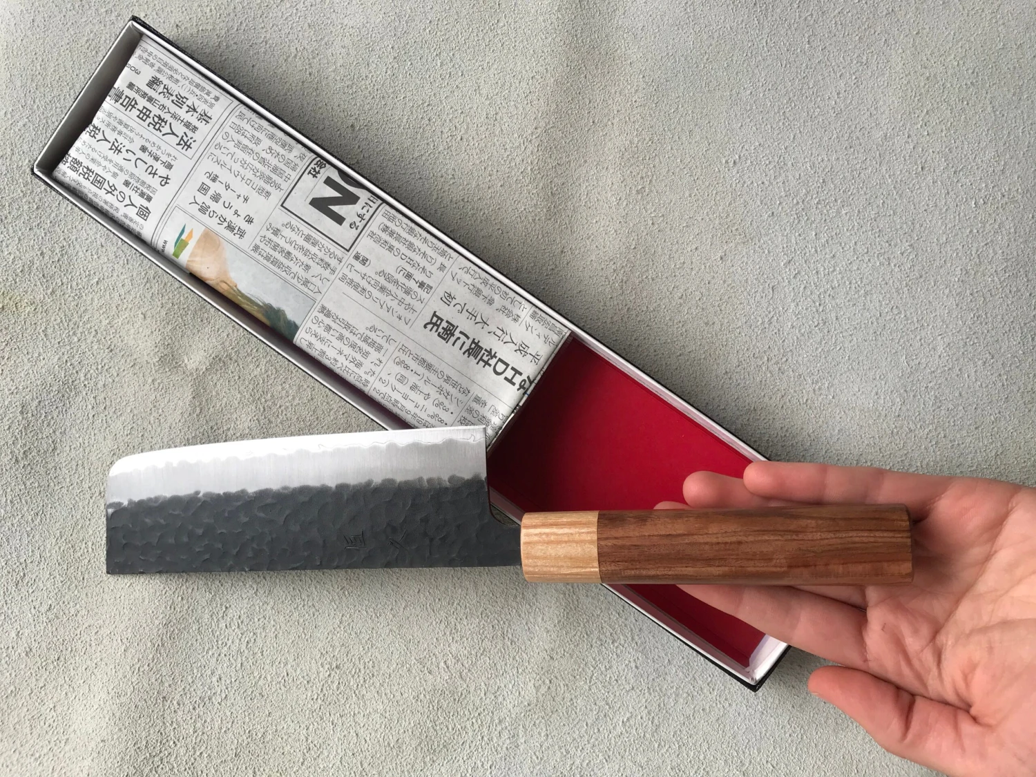 Kuro-uchi finish, theย unprocessed (black) part on the top side of the blade has already developed a dark patina, which protects the blade and givesย it a unique and rustic appearance. The bladeย was treated with hammer blows, resulting in a texturedย tsuchimeย look,ย which gives it a beautiful finish and also prevents food from sticking to the blade.