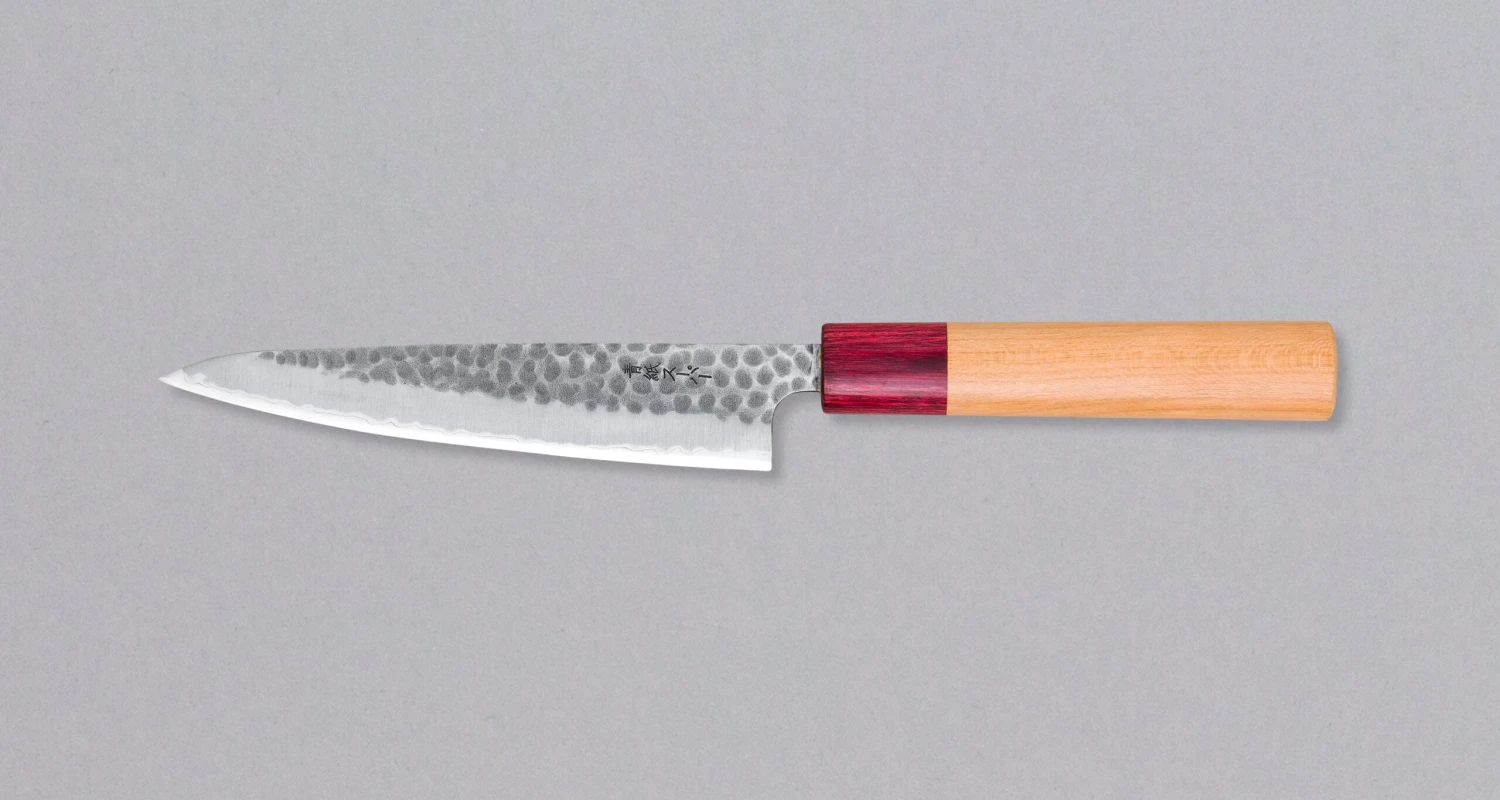 Tsunehisa Petty Aogami Super Cherry 135mm (5.3″)Ā is a multi-purpose knife with hammer dents and a beautiful cherry wood handle. The shape of the blade will suit anyone looking to complete their collection with a smaller knife, perfect for more delicate and freehand tasks where a larger (and wider) knife would perhaps prove too unwieldy.Ā Due to the choice of steel, the blade is also very easy to sharpen.