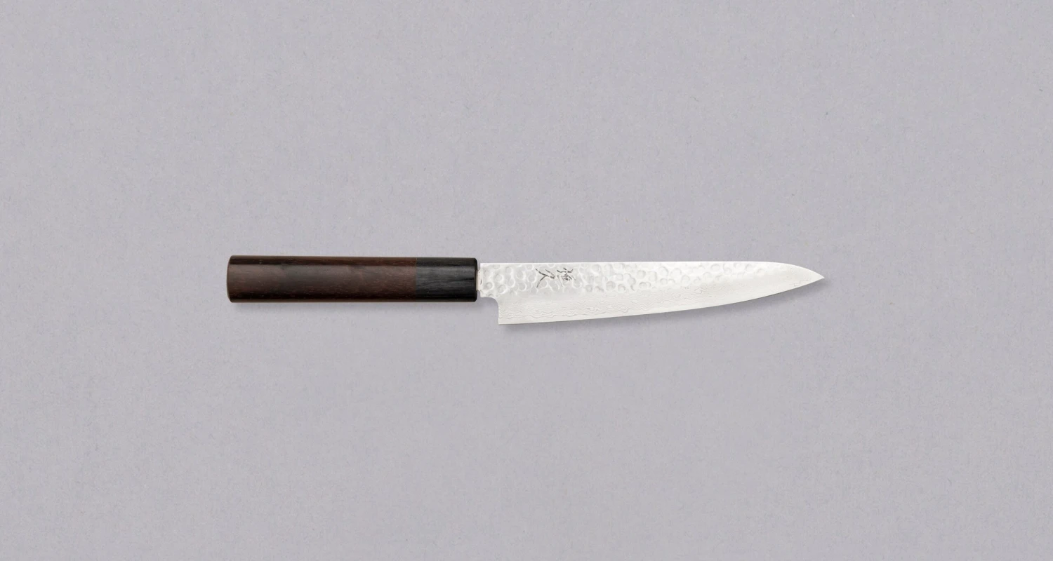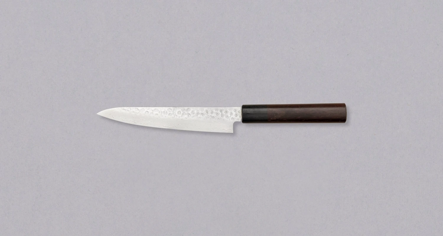 Tsunehisa Petty VG-10 Damascus Tsuchime 150mm is aย small multi-purpose Japanese kitchen knifeย thatย can be used for peeling, mincing, paring and decorating food.ย Aย blade length of 150mm is slightly on the larger side, with a profile that makes it perfectly usable as a stand-alone knife, not just as a complimentary piece to a larger multi-purpose knife.ย The upper part of the blade features a hammeredย pattern, which then transform into an intricate damascusย that flows down to the cutting edge.ย