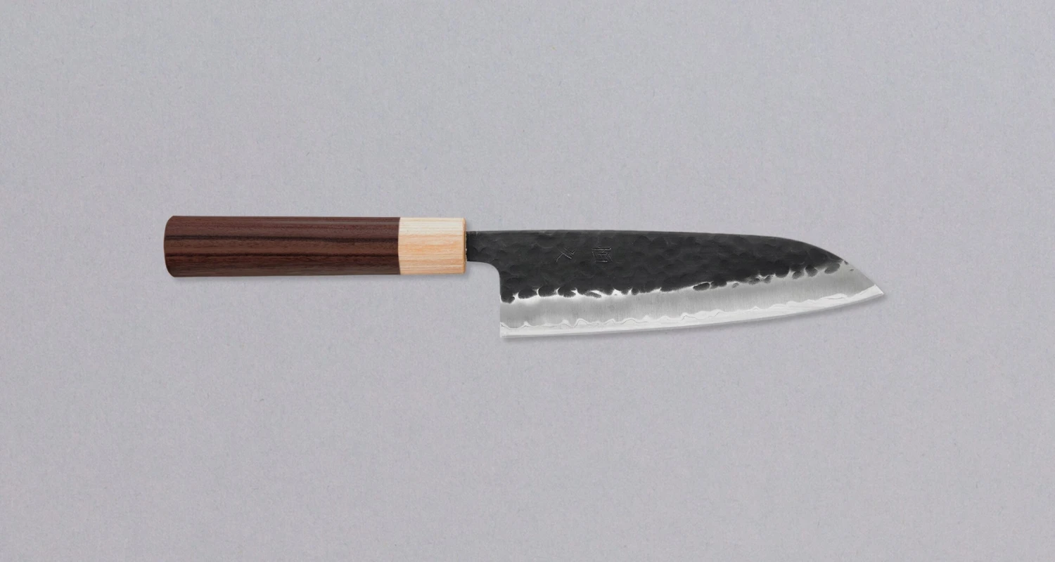 Tsunehisa Santoku Kuro-uchi 165mm is a wonderful hand-forged knife with a black Kuro-uchi protective patina and hammer dents. The blade design will suit anyone looking for a smaller, versatile knife for vegetables, fish, and meat. It will excel at chopping vegetables on the cutting board. The choice of steel also makes it very easy to sharpen.