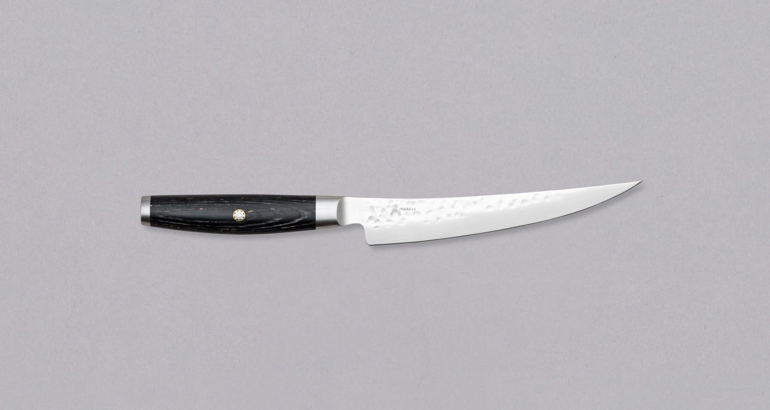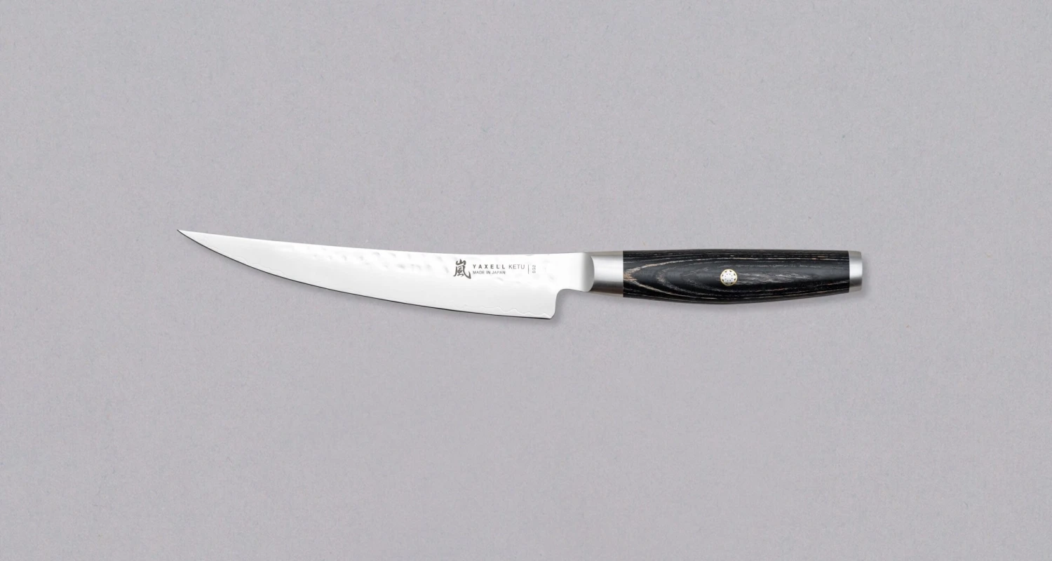 The Yaxell Ketu Boning 150mm is made of 3-ply stainless steel with a core of strong SG2 powder steel (63 HRC) and an elegant handle of black pakka wood. This knife is suitable for deboning poultry, separating meat from the bone and skinning and trimming meat. The weight of the handle perfectly complements the weight of the blade, providing a balance that makes handling effortless, comfortable and safe. With its thin blade, this knife cuts both meat and fish with minimal effort. Ideal for both home cooks and professional chefs.