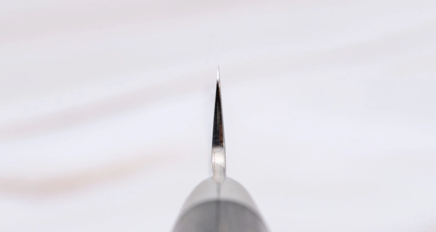 A high hardness of around 63 HRC means the blade won’t be very tough, so the blade’s core was laminated using the san-mai method to improve its structural integrity and subsequent ability to withstand impacts and prevent chipping. San-mai translates to “three layers” in Japanese, referring to a blade that is composed of an inner layer of harder steel (hagane) and of two outer layers of softer steel (jigane) that protect the core.