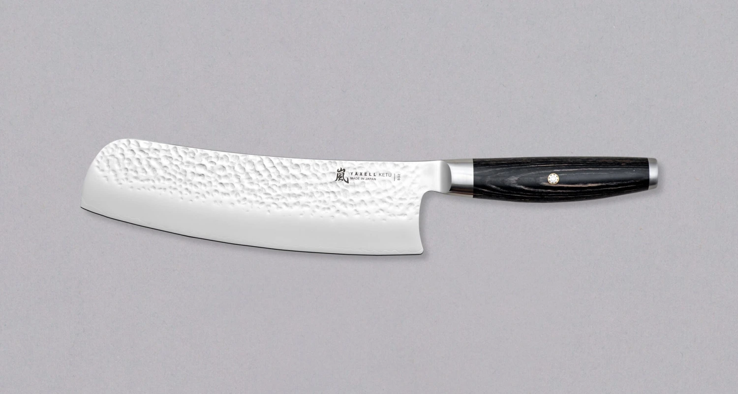 The Yaxell Ketu Konata 215mm is a large and elegant all-rounder – the shape of the blade is an interesting fusion of Santoku, Nakiri and Chinese cleaver. Basically, this knife falls into the category of multipurpose kitchen knives, with which you can prepare a variety of vegetable and meat dishes.