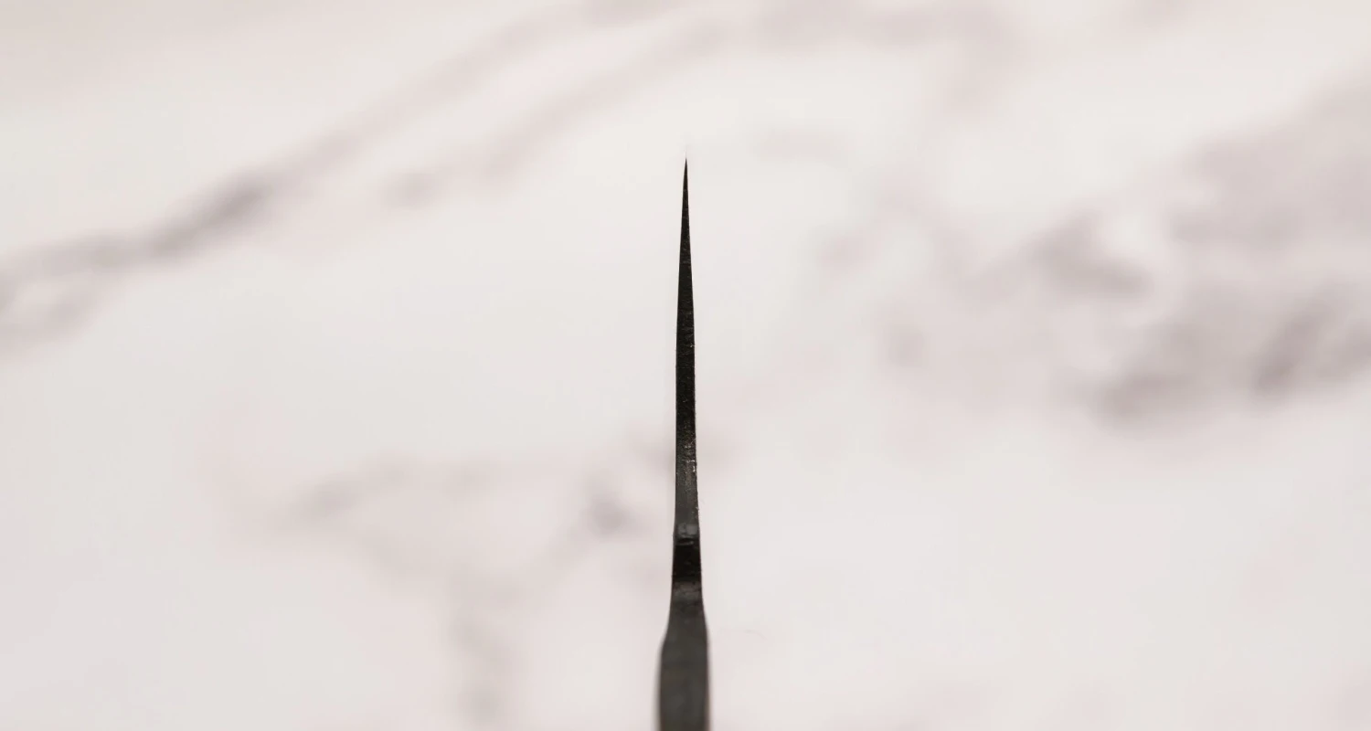 It has a double bevel (symmetrical) blade and is suitable for both left- and right-handed users. The blade tapers distally, meaning that the blade becomes increasingly thinner from the heel of the blade towards the tip. This gives it more strength and weight at the handle (meaning we can exert more pressure with the heel) and more precision at the tip, allowing for smooth and precise cuts.