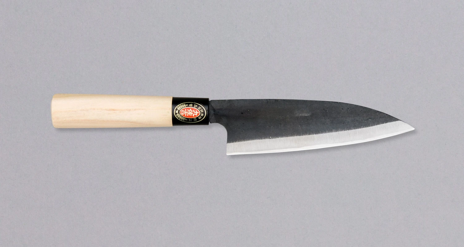 Yoshida Kuro-uchi series knives are traditional Japanese rustic knives. Its price is very affordable for the quality of a hand-forged knife. It is suitable for the first purchase of a traditional Japanese knife. The blade is forged in SUJ-2 steel, which offers incredible capacities, hardness is 63-64 HRC, and at the same time the knife is very easy to resharpen. The blade needs some extra care. After the use rinse it well and dry it.