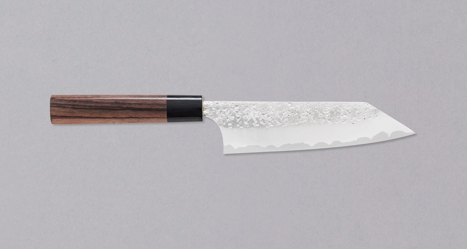 Yu Kurosaki is a talented master blacksmith, located in Takefu Knife Village, close to the city of Echizen. His knives are well known in Japan and around the world for their beautiful, special-looking design and great quality. Hammer’s dents on the blade are his unique signature, and like snowflakes, not a single dent is alike. Needless to say (but we will say it anyway), his knives not only look great, they are made of high-quality steels and come with a razor sharp, long-lasting edge.