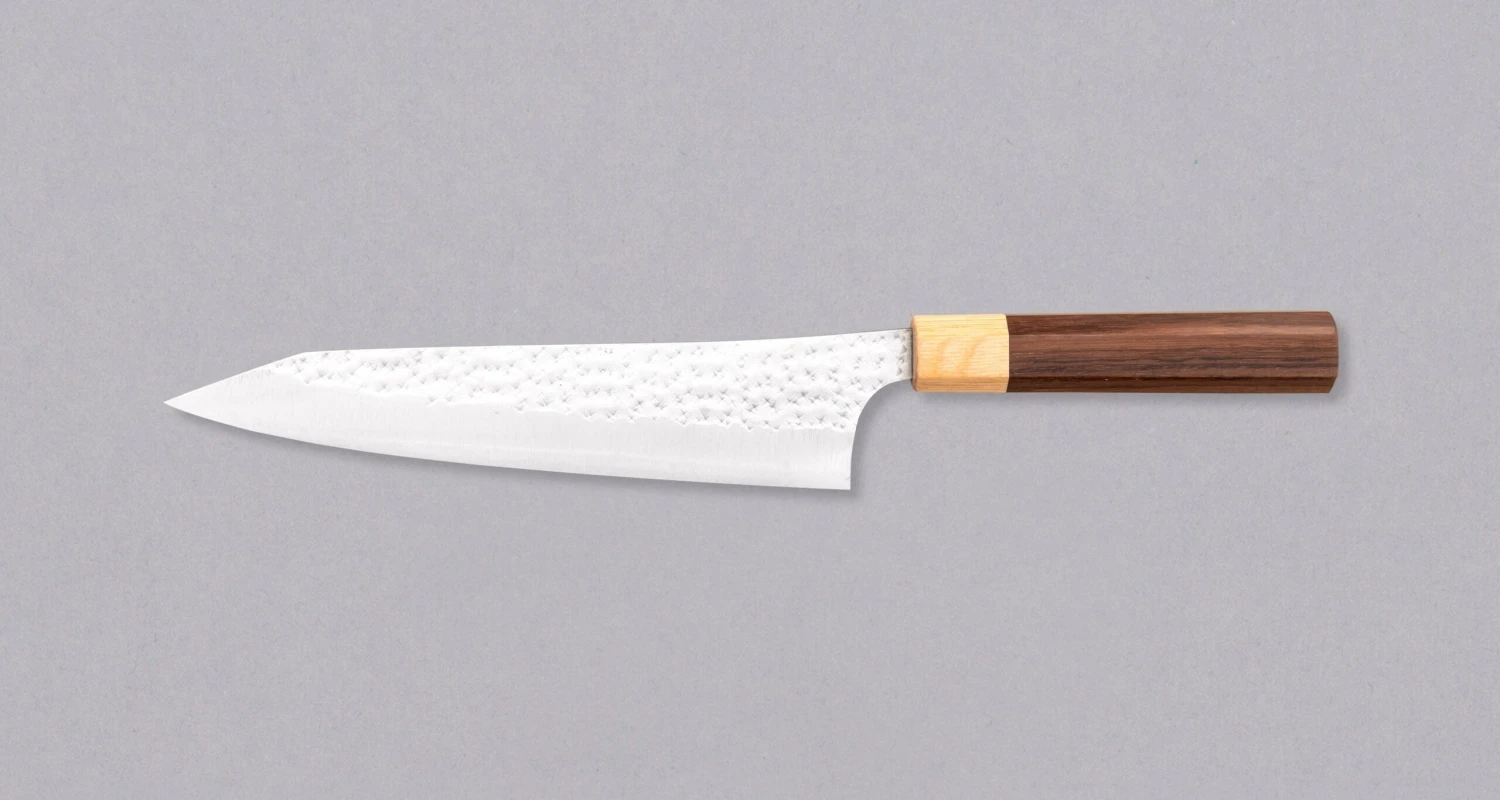 Yu Kurosaki is a talented master blacksmith who lives in Takefu Knife Village, close to the city of Echizen. His knives are well known throughout Japan and also around the world for their beautiful, unique-looking design and superior quality. Hammer’s dents on the blade are his signature finish, and just like with snowflakes, not a single dent is alike. Needless to say (but we will say it anyway), his knives don’t only look great but they’re also made of high-quality steel and have a razor sharp, long-lasting edge.