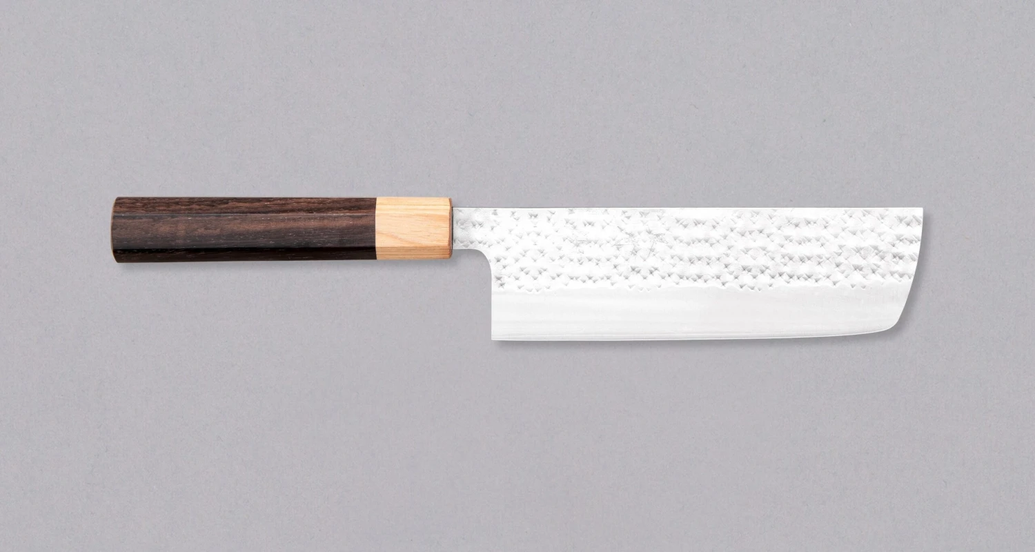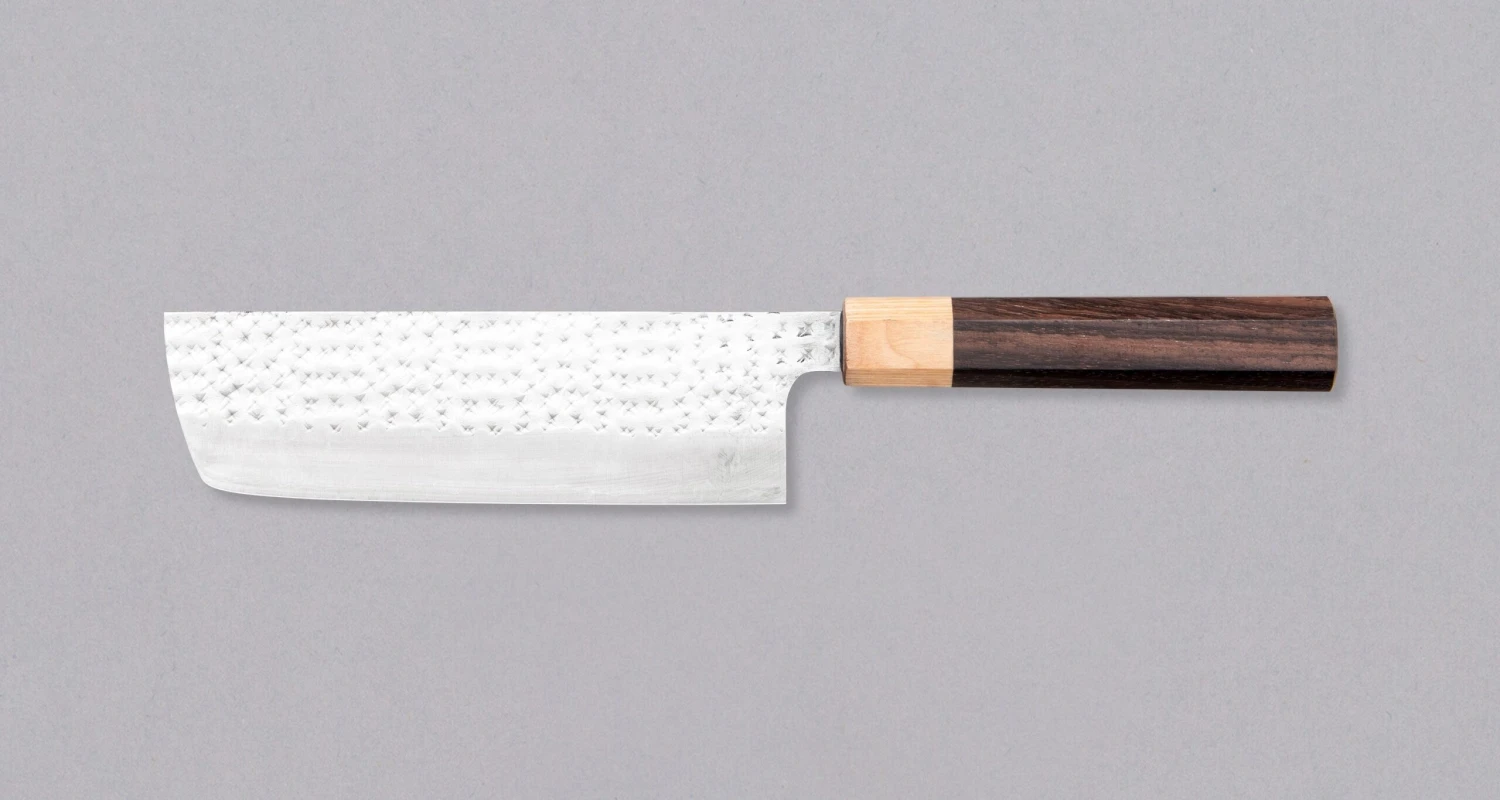 Kurosakiย Nakiri from the Senko line is another uniquely looking blade from the hands of a talented master blacksmith Yu Kurosaki. The unique hammer imprints on the top part of the blade resemble a dazzling diamond pattern โ hence the name SENKO. The blade has a high polish finish.
