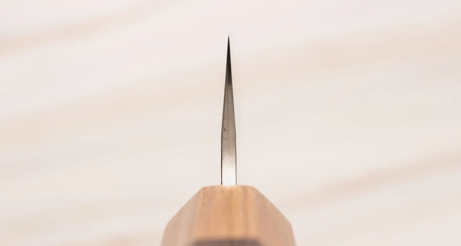The subtle combination of the migaki polished finish and the triangular hammer impressions is the hallmark of Kurosaki knives. The textured blade* ensures that food does not stick to the blade, and thanks to the unique shape of the pattern, the blacksmith has ensured that the light from the blade glistens as if from a water surface.