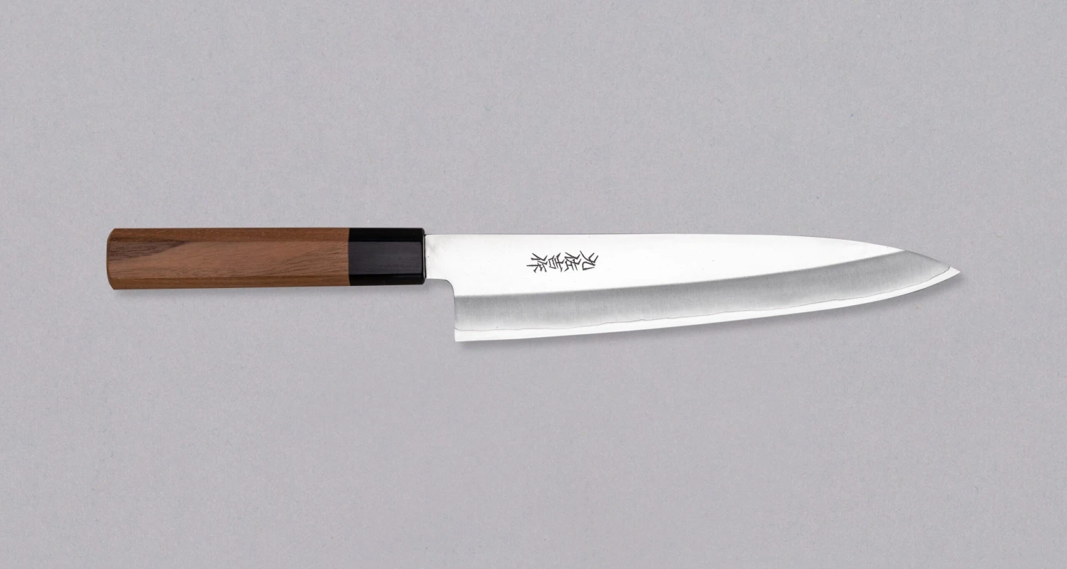 Gyuto is the most versatile and useful blade shape in the modern kitchen. It has a wide profile for easy food transfer and tends to be fairly flat towards the heel, enabling easy and fast chopping on the cutting board. A pointed tip allows piercing and precise, delicate work. A slight curve between the tip and the midsection makes the belly great for rocking the blade back and forth when cutting. It can be used for cutting meat, fish, and vegetables.