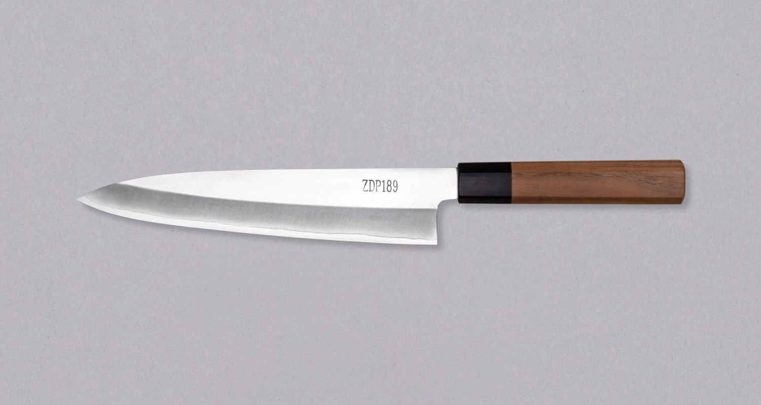 This Gyuto was fitted with a traditional Japanese wooden handle, called Wa. The wooden handle is made of Walnut wood and has an octagonal shape, which fits well into the hands of both left- and right-handed users.